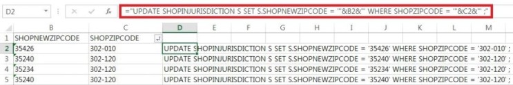 ="UPDATE SHOPINJURISDICTION S SET S.SHOPNEWZIPCODE = '"&B2&"' WHERE SHOPZIPCODE = '"&C2&"' ;"